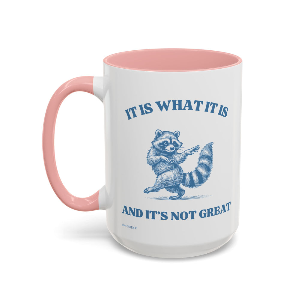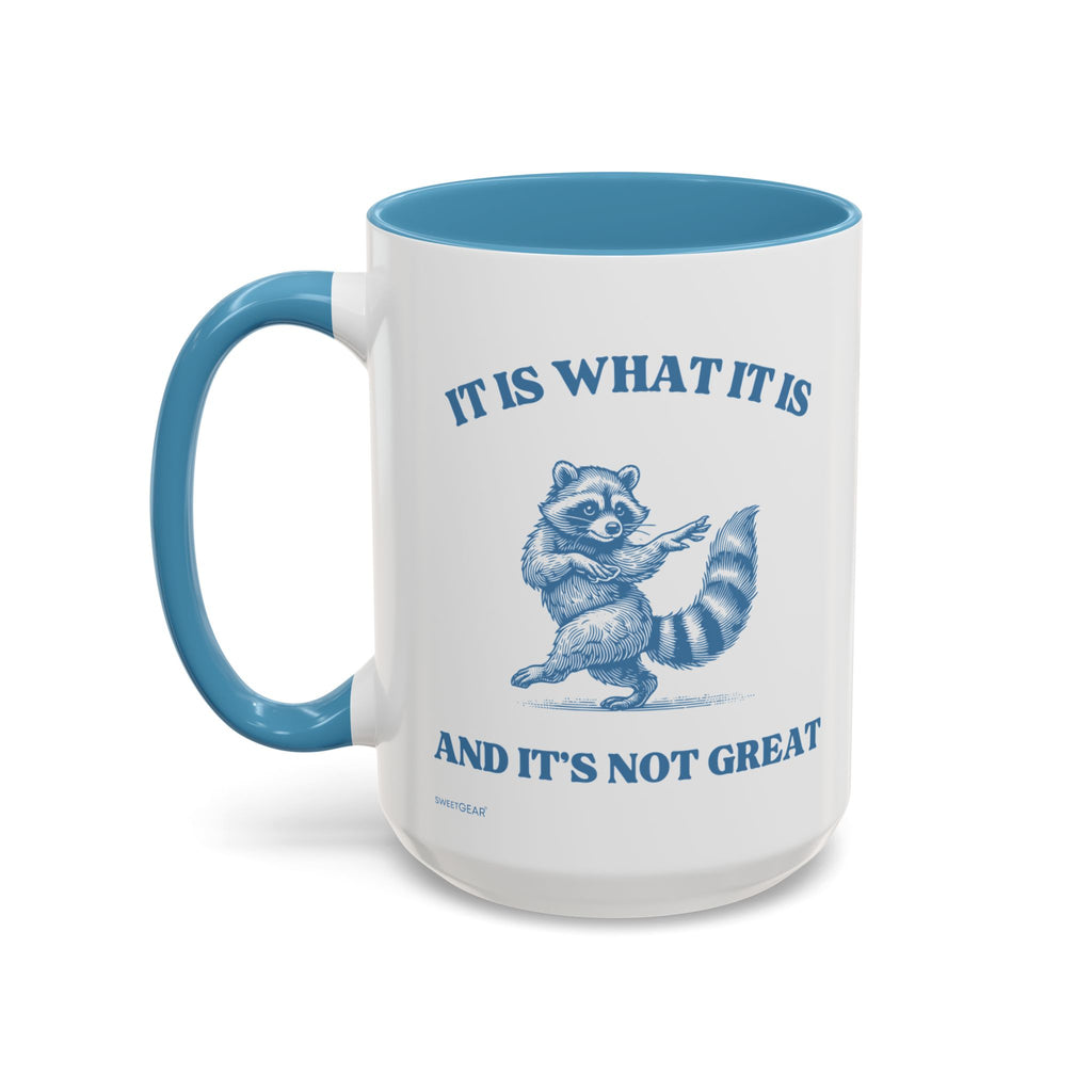 This humorous coffee mug features a quirky dancing raccoon and the amusing phrase, "It is what it is and it's not great." Perfect for those who appreciate a little sarcasm with their morning coffee, it’s a fun addition to any mug collection!