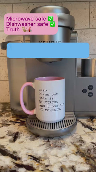 This funny coffee mug features a quote that says 'Crap turns out this is MY CIRCUS and those are MY MONKEYS' perfect for moms. It gives a lighthearted and humorous vibe, making it a great addition to a mom's morning routine. Ideal for Mother's Day, birthdays, or just to brighten up any day with its playful design.