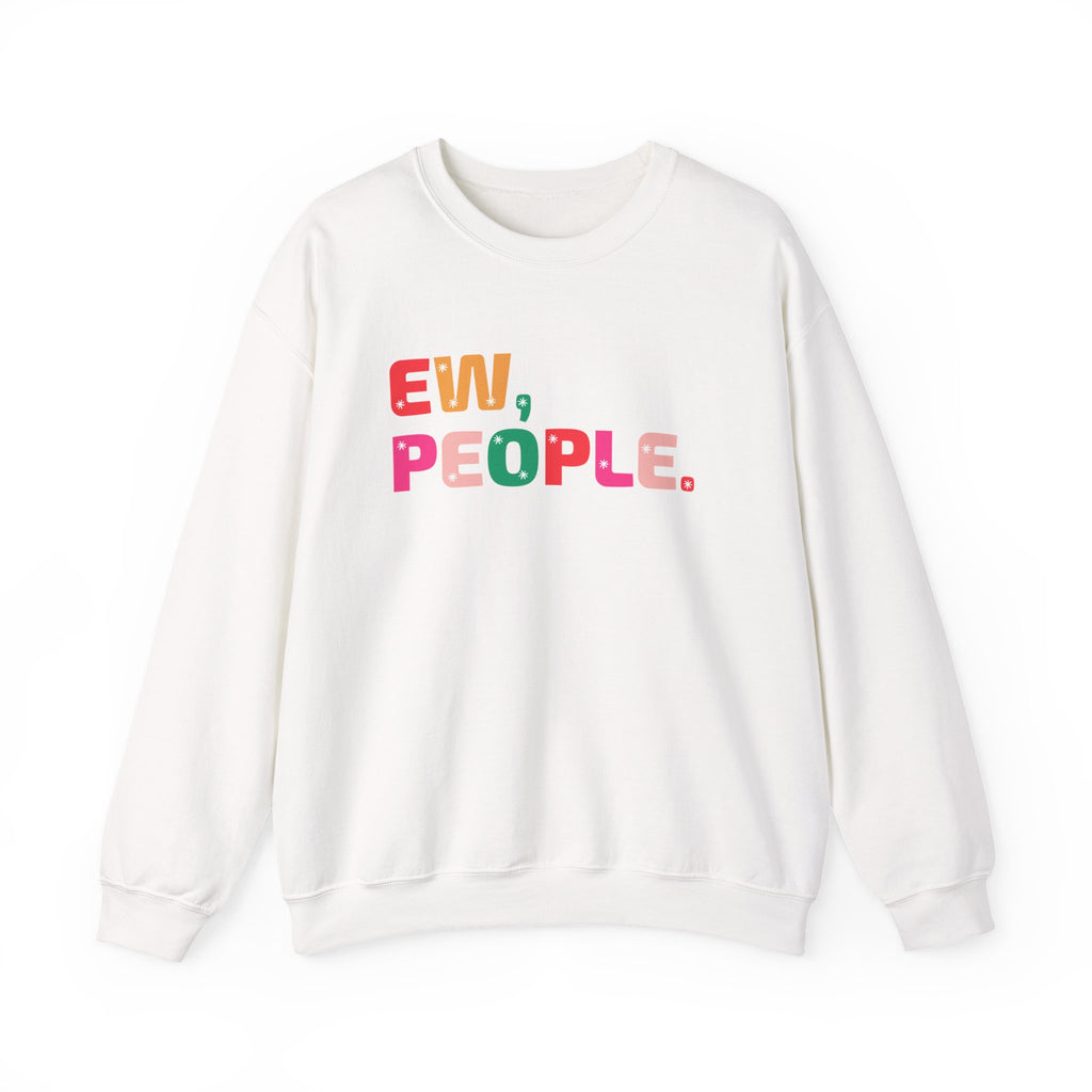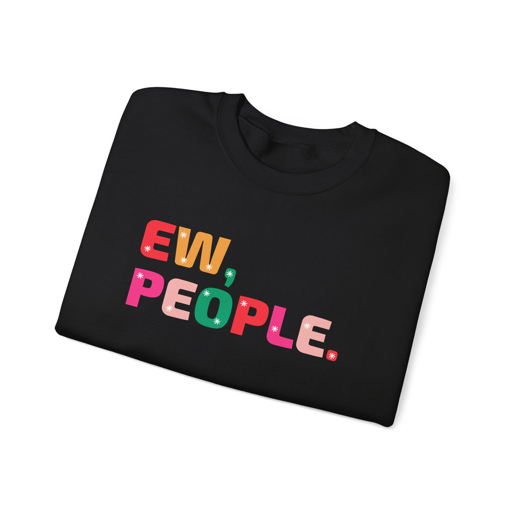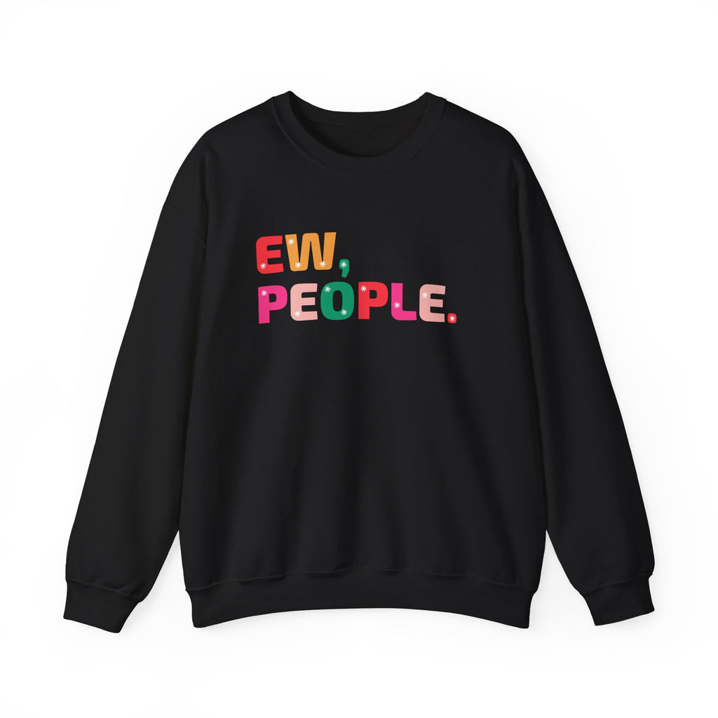 A cozy unisex sized crewneck sweatshirt featuring the text 'Ew, People.', perfect for the holiday season. It gives off a festive and sarcastic vibe, ideal for those who love a bit of humor during Christmas and the holidays. This sweatshirt is perfect for lounging around the house or running errands in style.