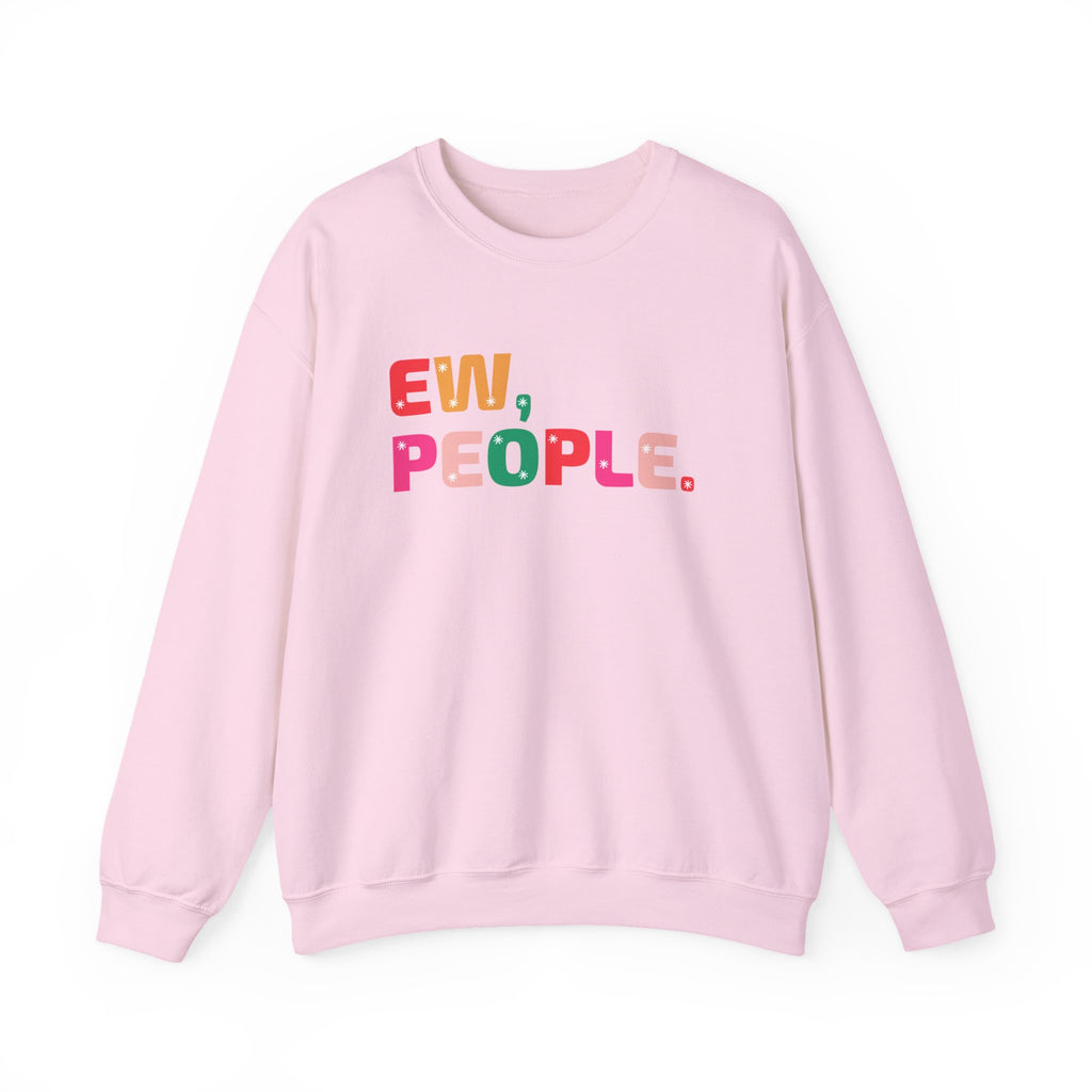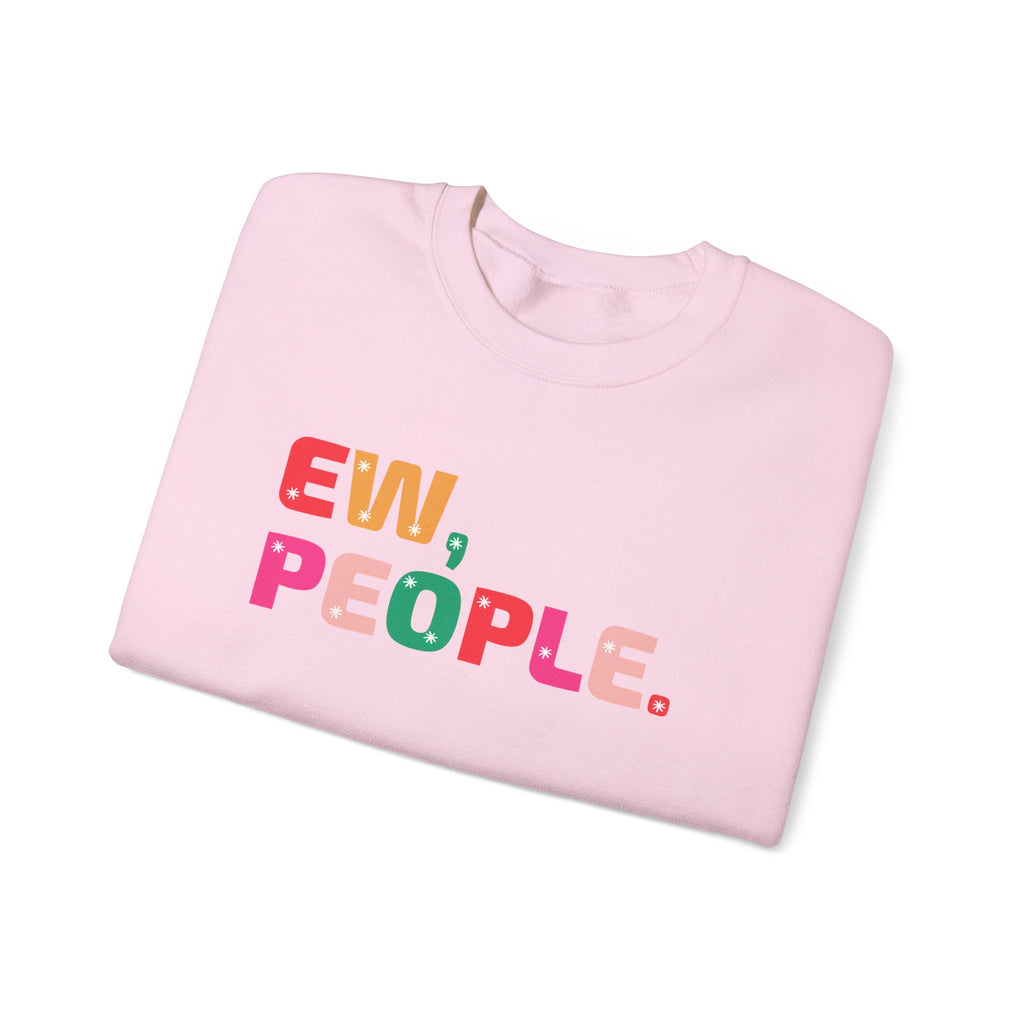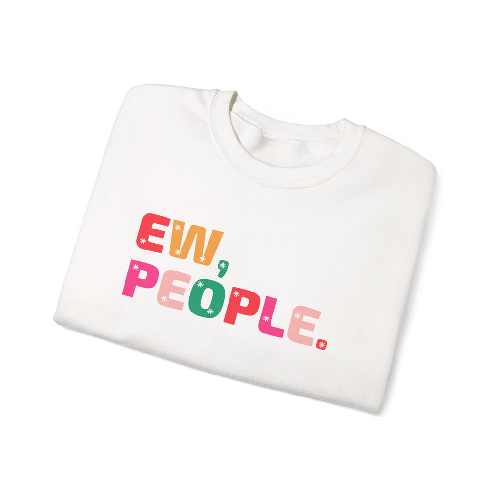 A cozy unisex sized crewneck sweatshirt featuring the text 'Ew, People.', perfect for the holiday season. It gives off a festive and sarcastic vibe, ideal for those who love a bit of humor during Christmas and the holidays. This sweatshirt is perfect for lounging around the house or running errands in style.