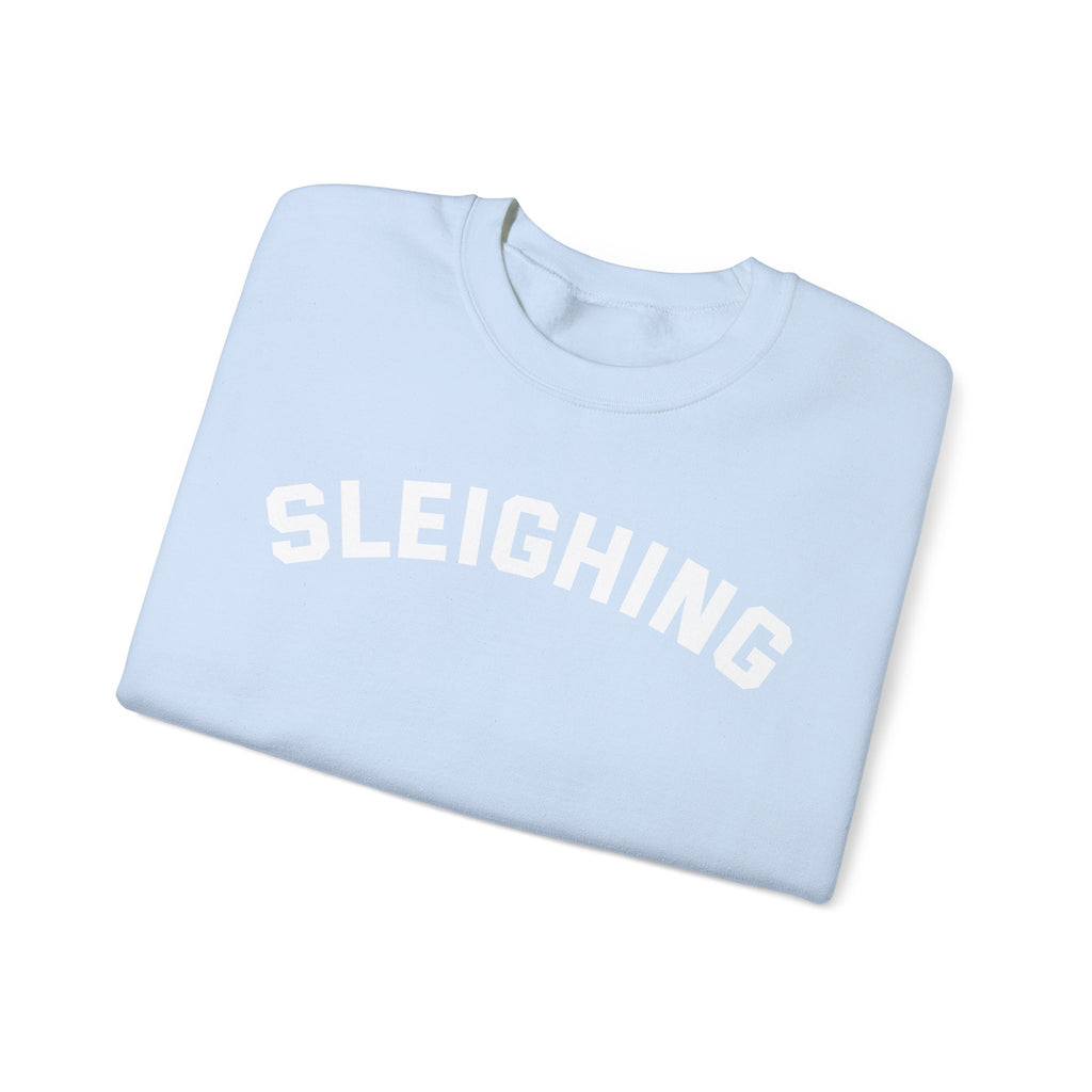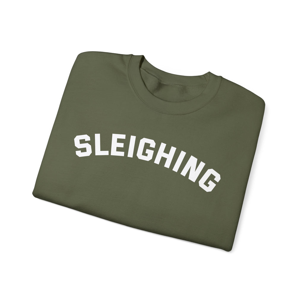 A cozy unisex sized crewneck sweatshirt featuring the phrase 'Sleighing.', perfect for the holiday season and for those who sleigh! It gives off a festive and fun vibe, ideal for those who love a bit of humor during Christmas and the holidays. This sweatshirt is perfect for lounging around the house or running errands in style.