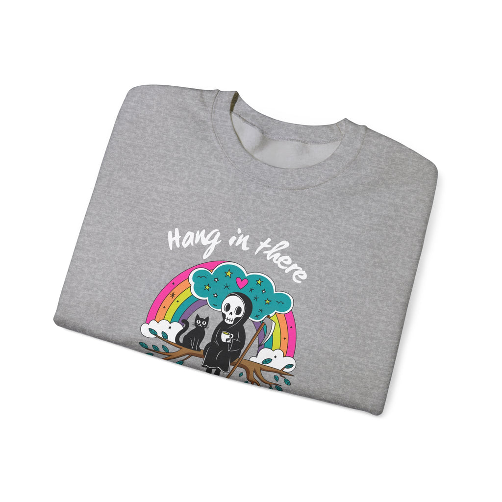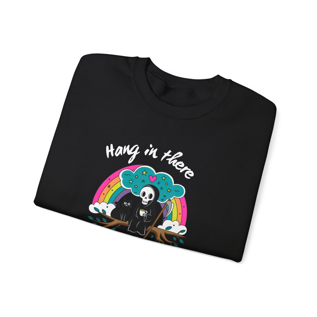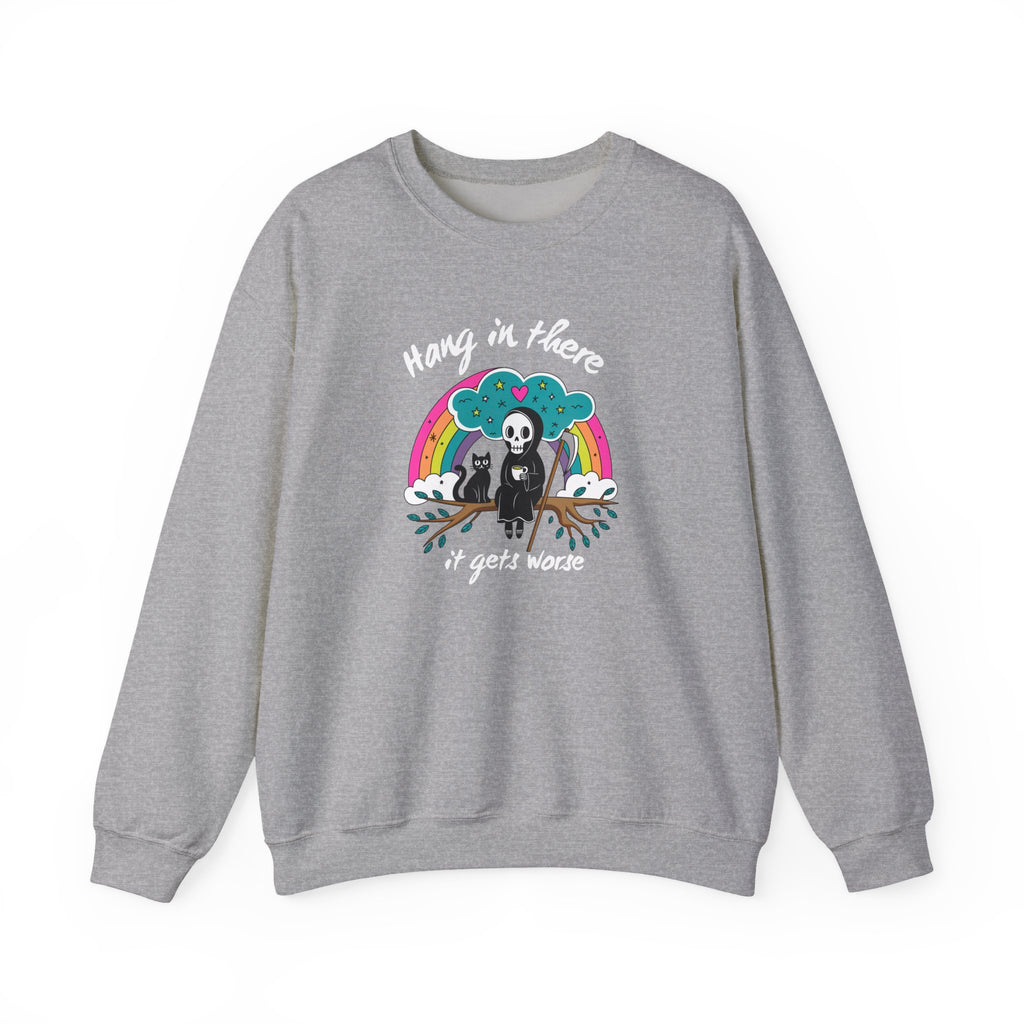 A cozy unisex sized crewneck sweatshirt featuring the phrase 'Hang in there it gets worse.' with the most adorable skeleton and his black cat. Perfect for the fall season and the perfect vibe. This sweatshirt is perfect for lounging around the house or running errands in style.